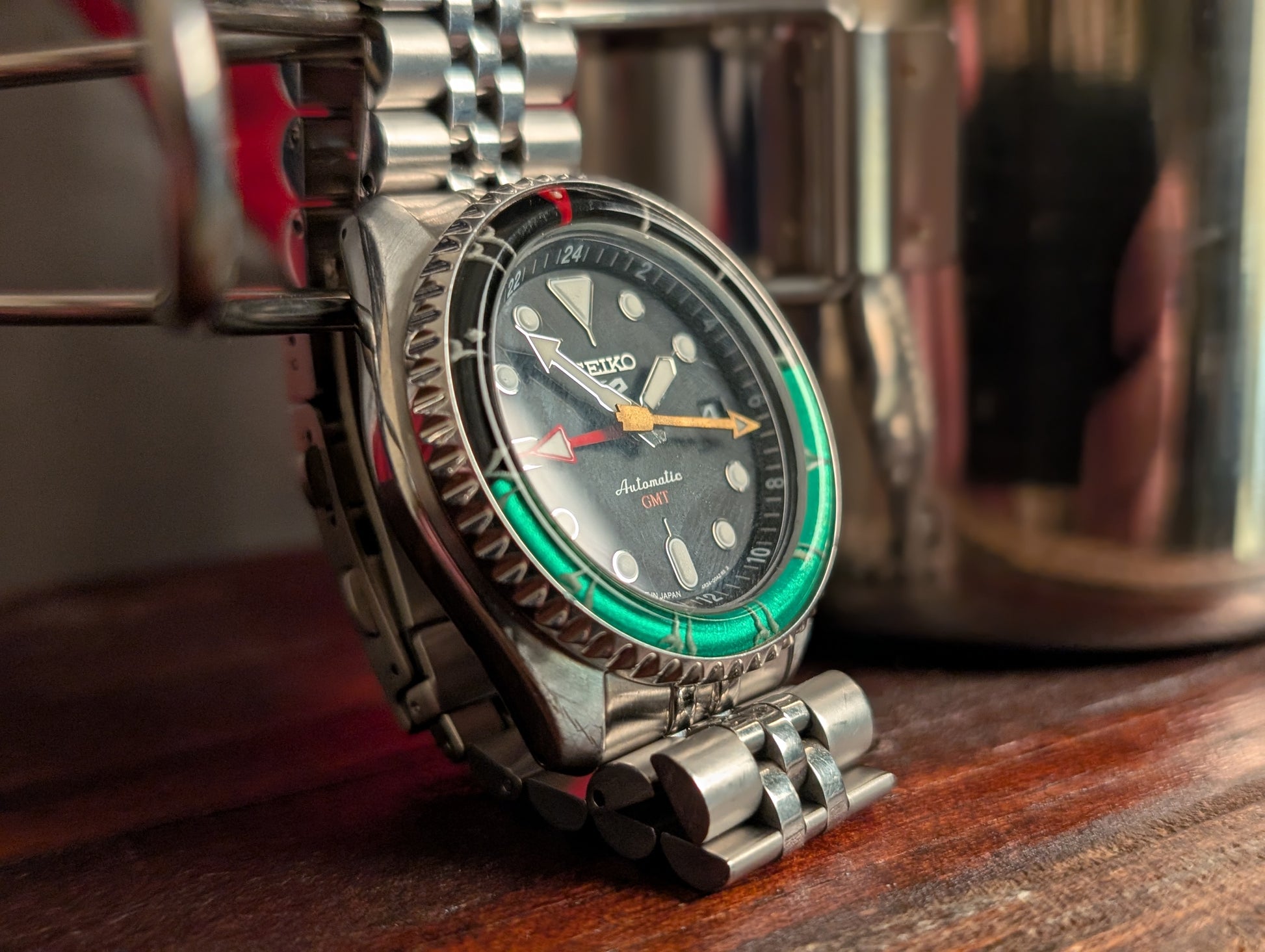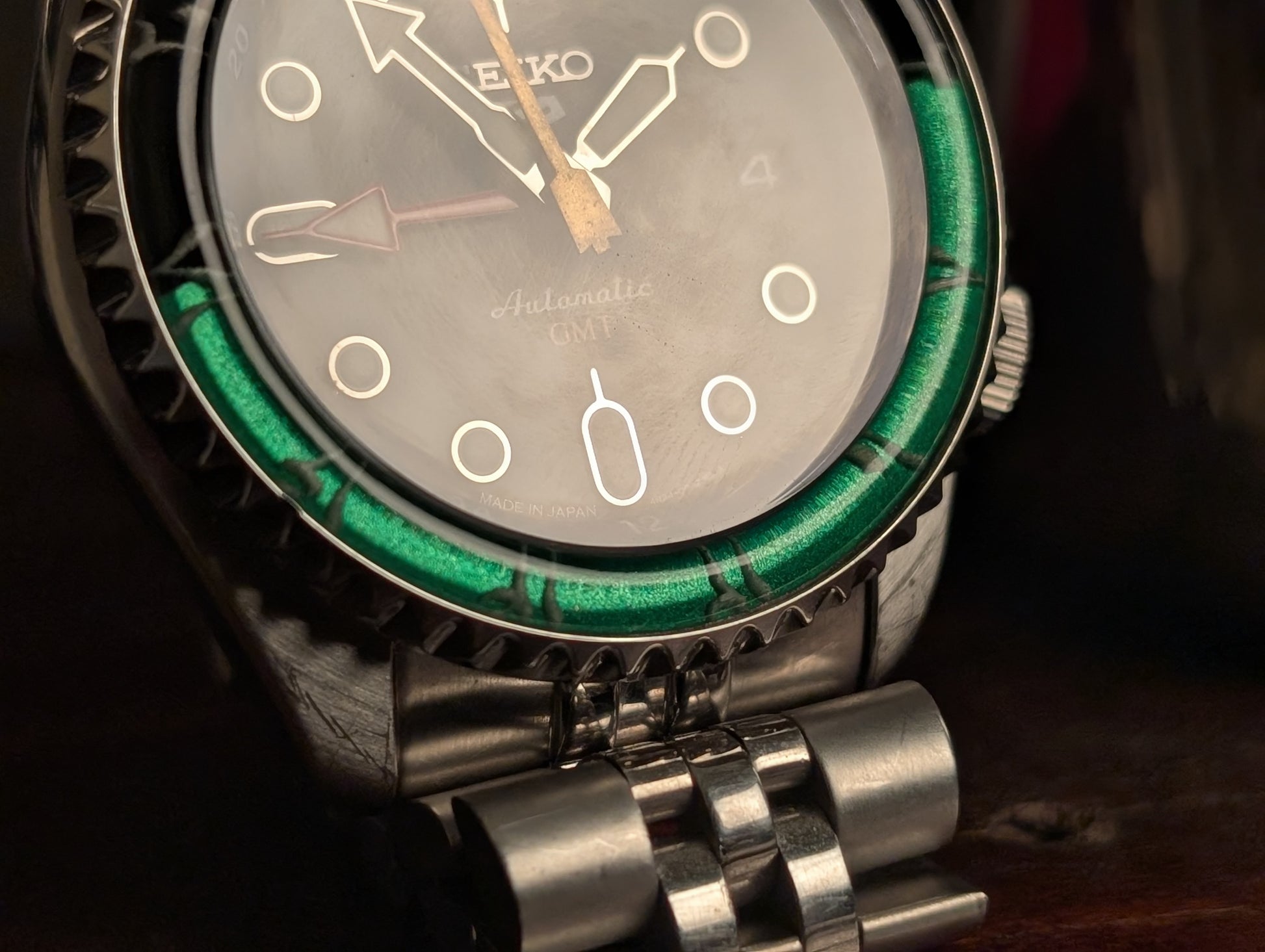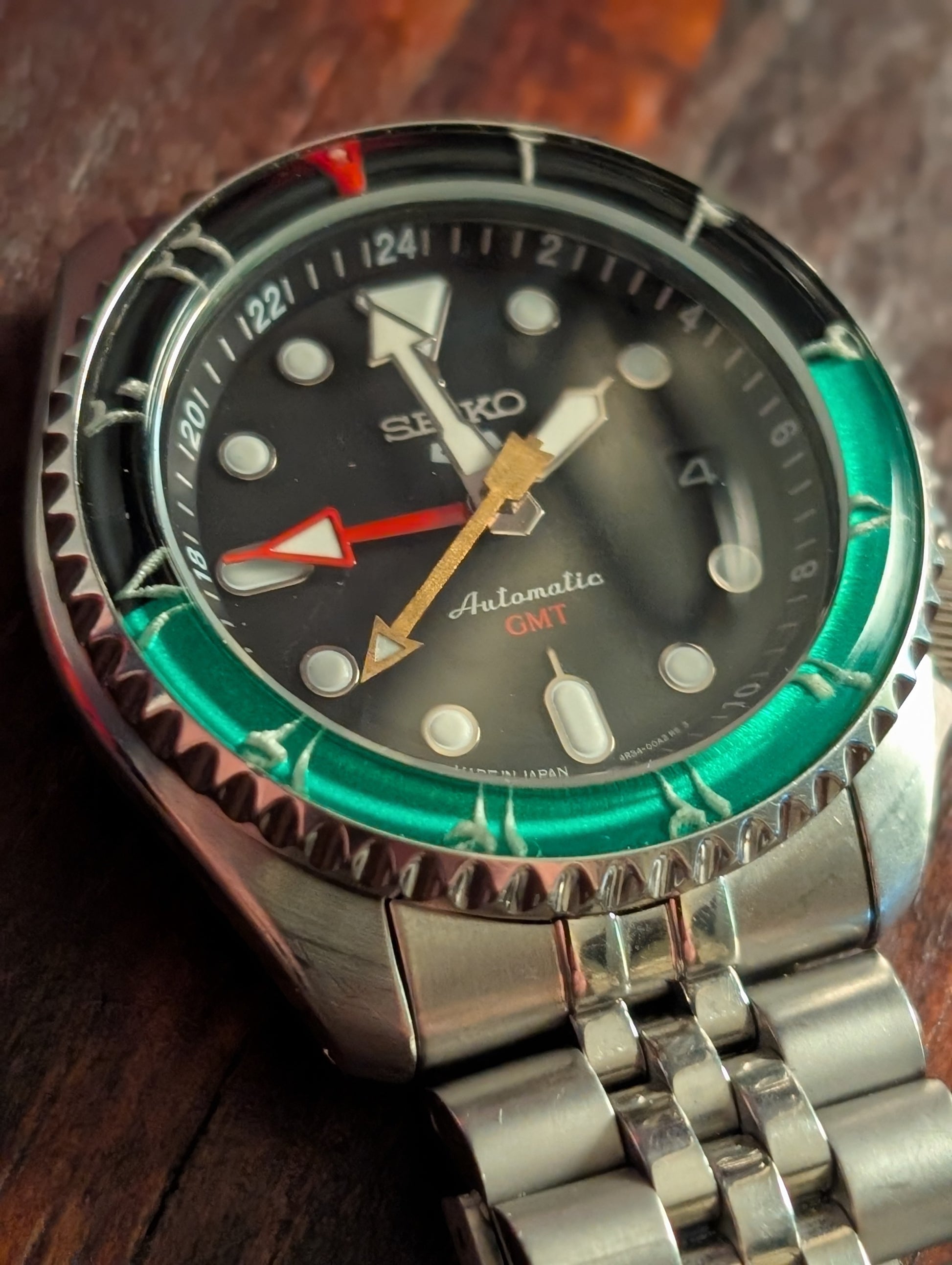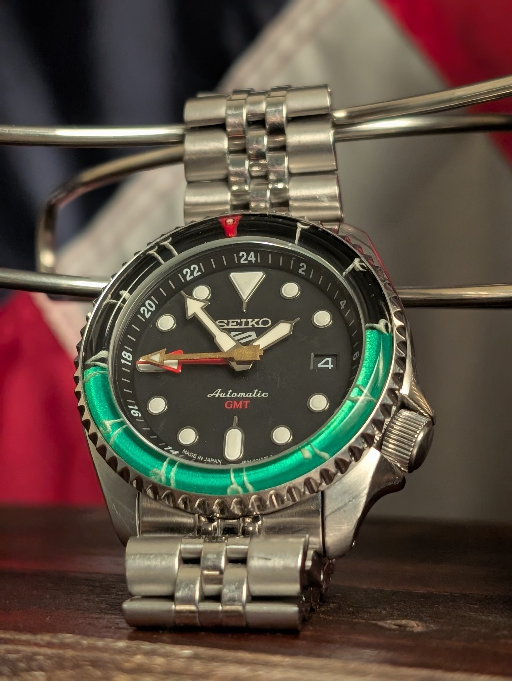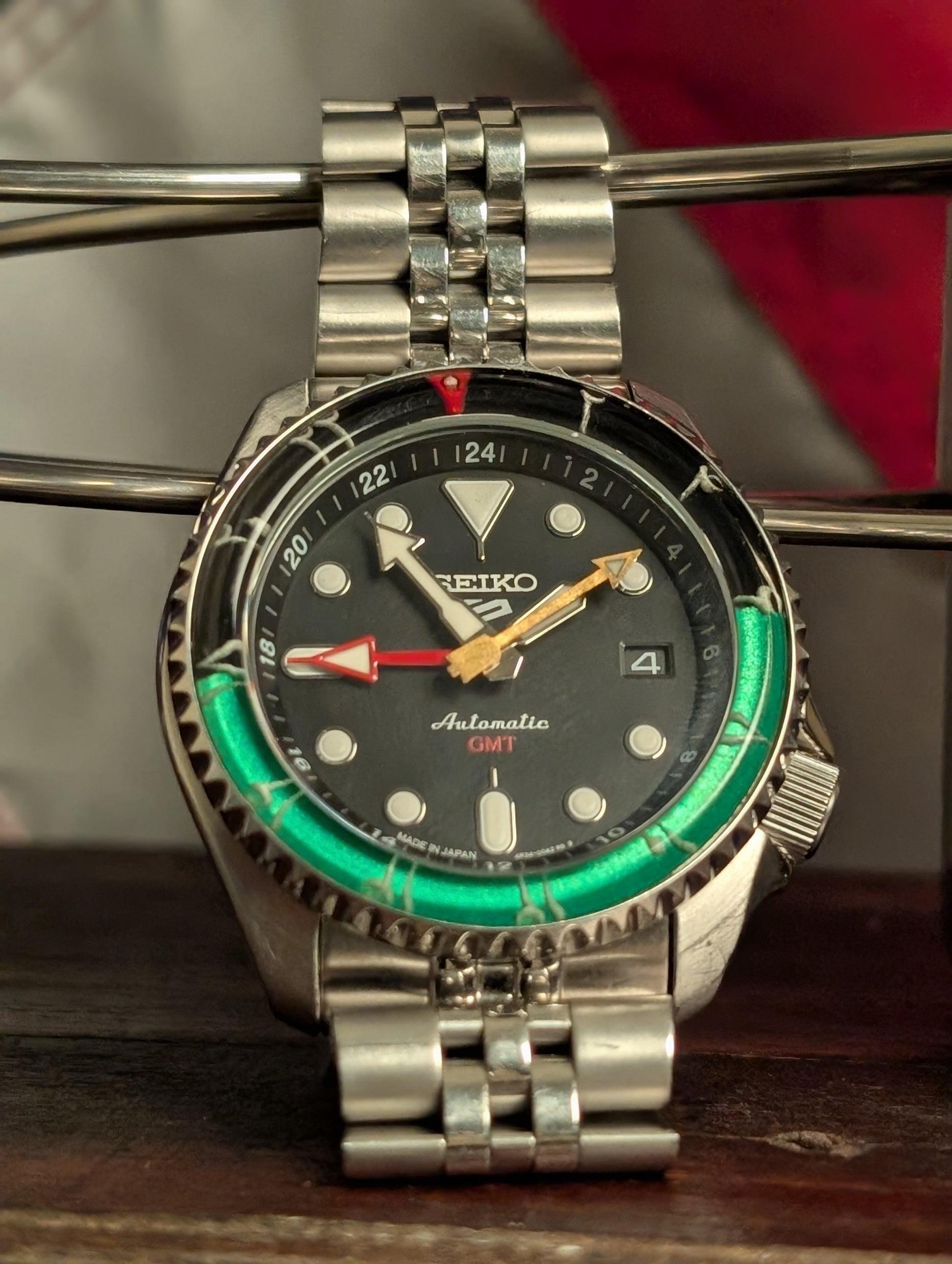 This seiko was chosen for this as it was the first " affordability gmt from seiko. If released during the height of gwot, given US SOF's history with seiko, i believe it would have been the watch of choice for a gmt. This seiko 5 gmt ssk001 looks nothing like the original. The bezel ring has been swapped to feel more tactile. The bezel insert is hand-made from an artisan in a coalition partner, Spain. shaped and polished by hand in the same process used by "omegala" speed masters and "molex" gmt masters